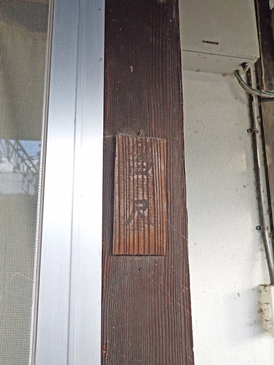 駅舎の線路側、出窓の柱には建物財産票がついている事が多いのですが、この駅には「曲尺」と書かれた謎の板が打ち付けてあります。