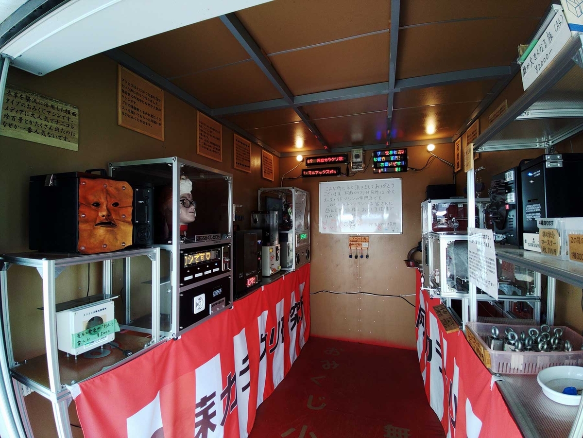 駐車場の隅には「阿蘇からくり研究所」のおみくじ小屋。中には生首、ロボット、仮面がおみくじを出してくれる謎の空間で、ちょっとどういう感覚なのか計りかねます。