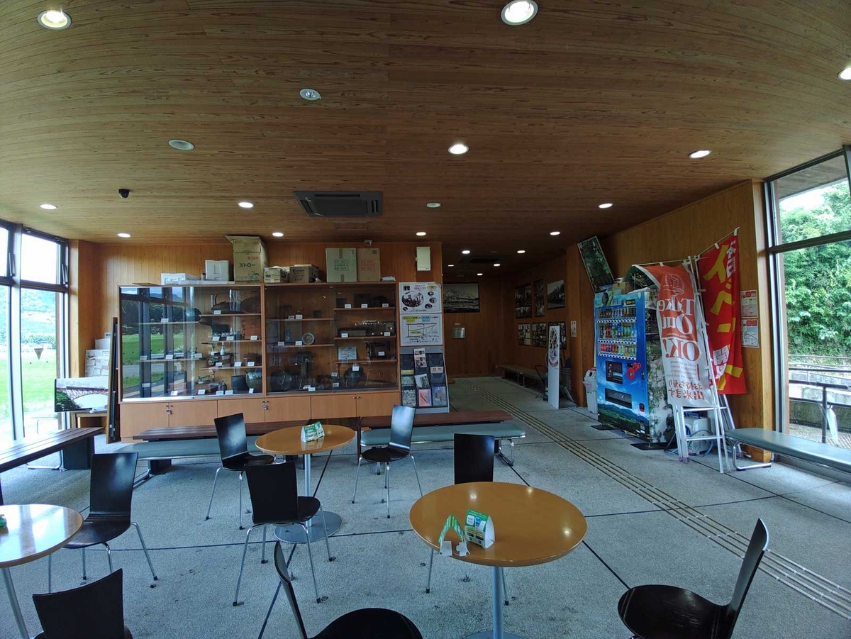 駅舎内は広いロビーになっていて一画に喫茶店が入居、反対側がトイレや展示室になっています。駅事務所とかは無く自動券売機、改札機も無し。展示室ではかつての高森線の写真やアンティック家具というか生活用品が展示されています(石油ランタンとサイレンとか、どういうコンセプトなんだろうか。どうもこのあたり、下田城駅で見た感覚に近いのかもしれない)