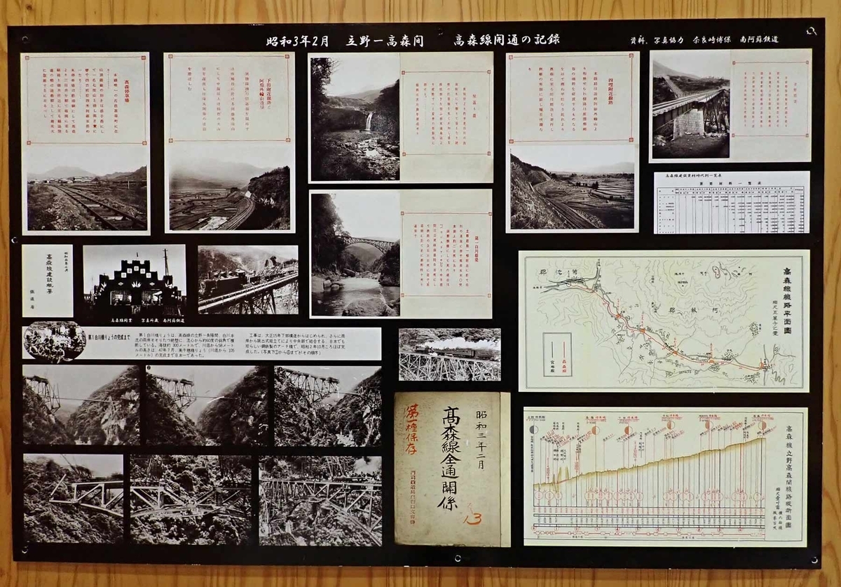 展示されている写真は立野、下田、高森駅のものが多い。長陽駅の写真とかに写っている外輪山が、今と比べて崖の地層がむきだしであまり草木に覆われていないのが印象的です。今見ている緑の山というのが、この半世紀ぐらいで出来上がって来たものだろう、という話を裏付ける様な写真。