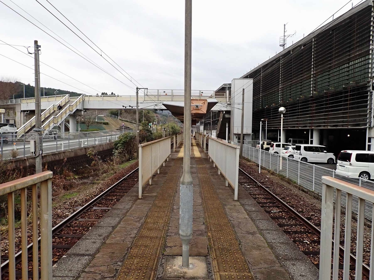 新水俣駅は島式ホーム1面2線があるだけの無人駅で、駅舎や待合室は無く自動券売機もありません。とはいえ新幹線駅のコンコースから高架下を歩いて行けるので、雨が降ってもあまり困らないしトイレもそちらを利用するのだと思います。ホームへは構内踏切で、駅裏(東側)には陸橋で渡ることが出来ます。