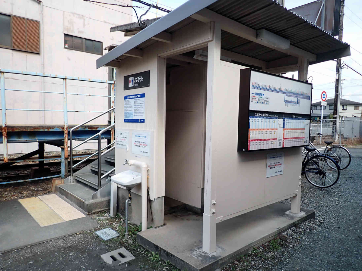 路地が西鉄甘木線を渡る踏切脇に馬田駅はあります。駅舎はなく単式ホームが1面のみの無人駅。ホーム上には屋根付きの待合所が1棟、ホーム前の広場が駐輪場(約10台分)になっていて、その奥にトイレ(水洗式)もあります。