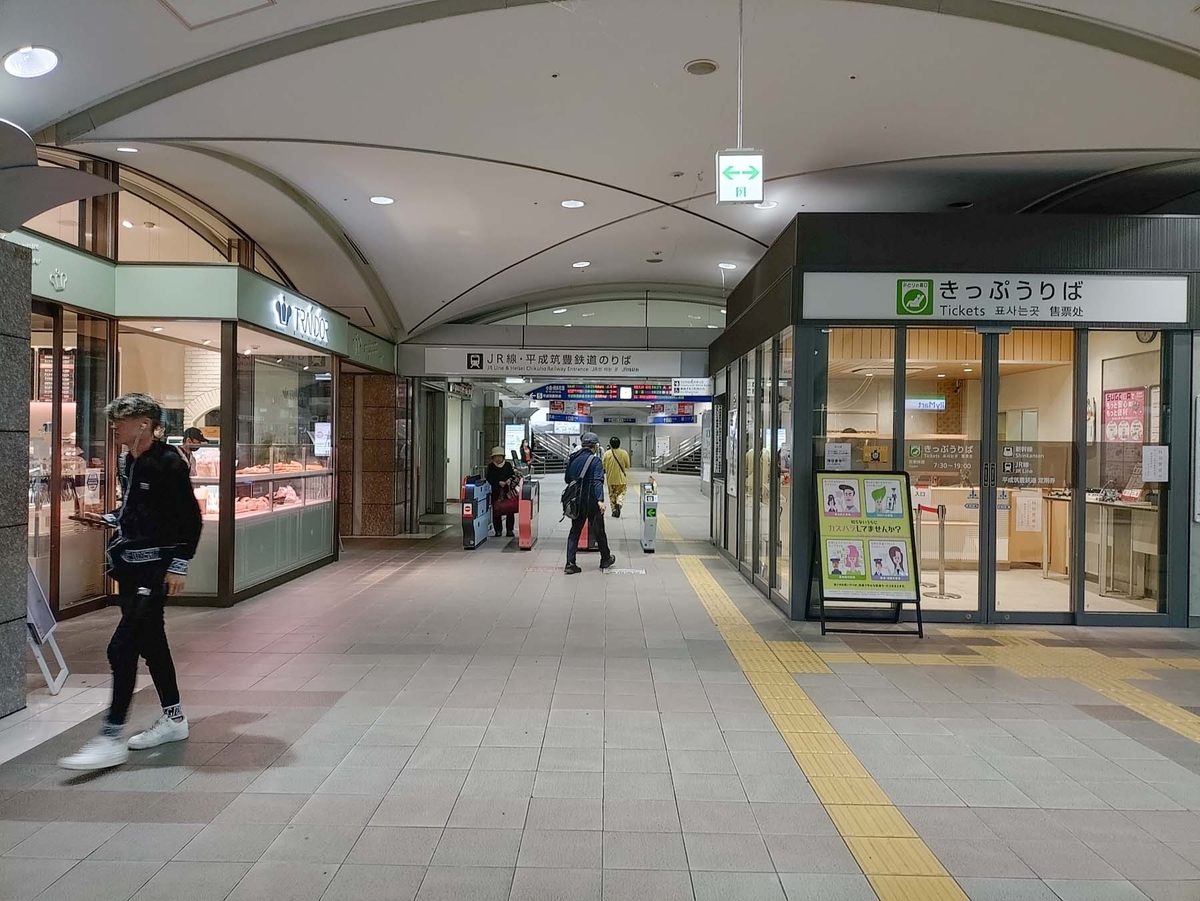 地上階はみどりの窓口や自動券売機(JRが3台と平筑が1台)、改札があり、えきマチ1丁目(という名の商店街)やコンビニも入っています。ただえきマチ1丁目にはKFCくらいしか開いてませんでしたが。