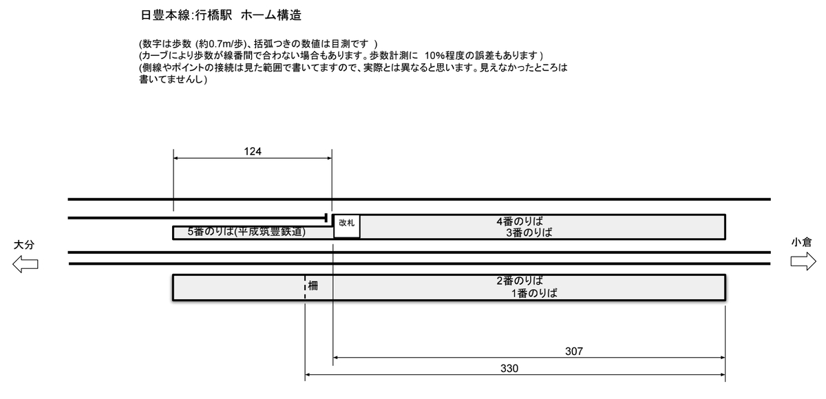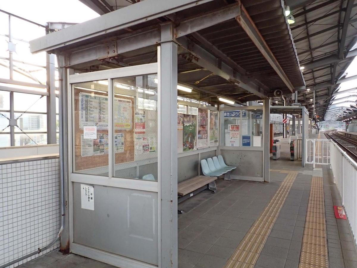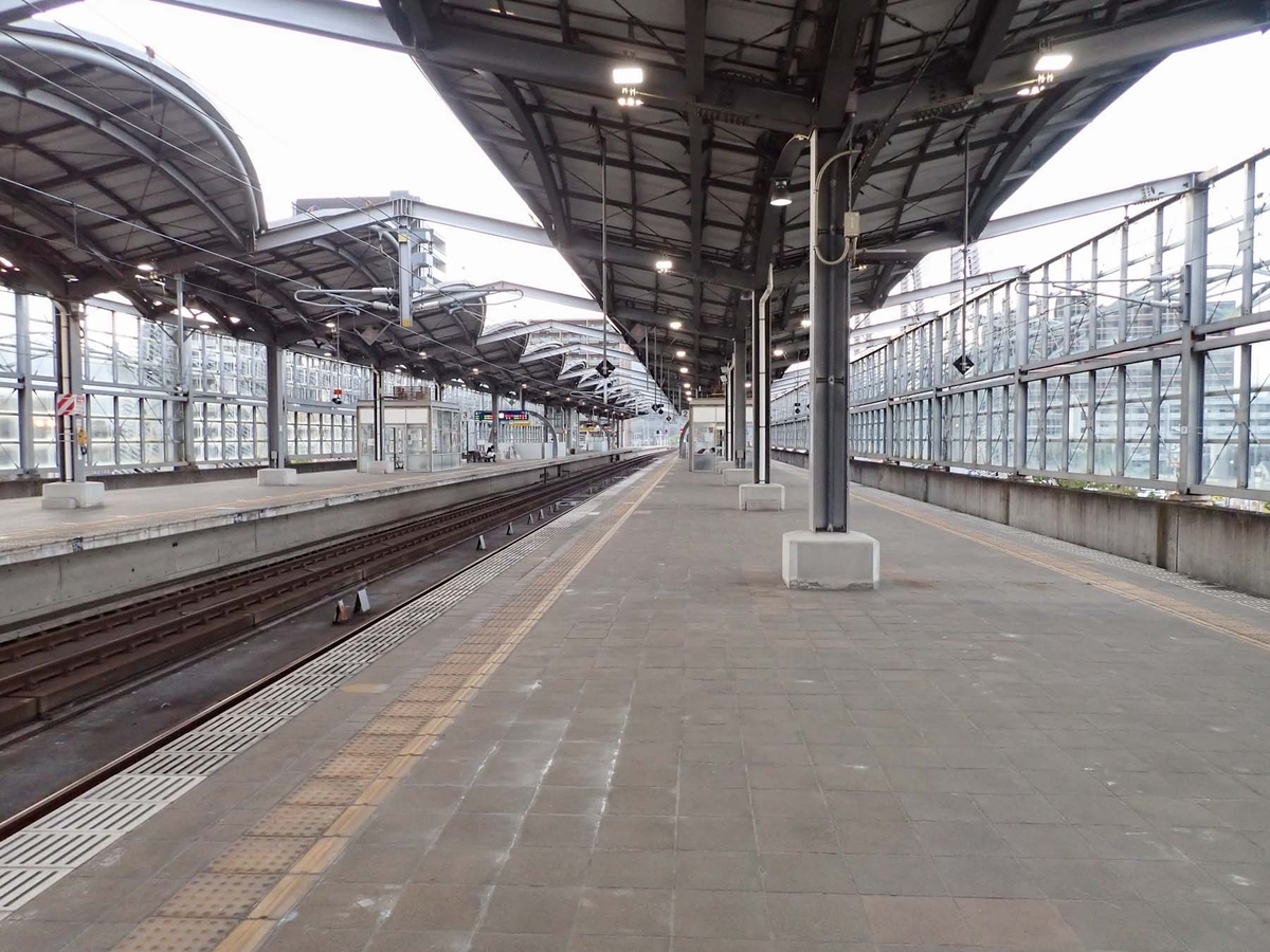 下の写真は2番のりばからみたホーム全景、ホーム長は柵内が330歩、柵外も含めると約420歩で在来線としては長い方。