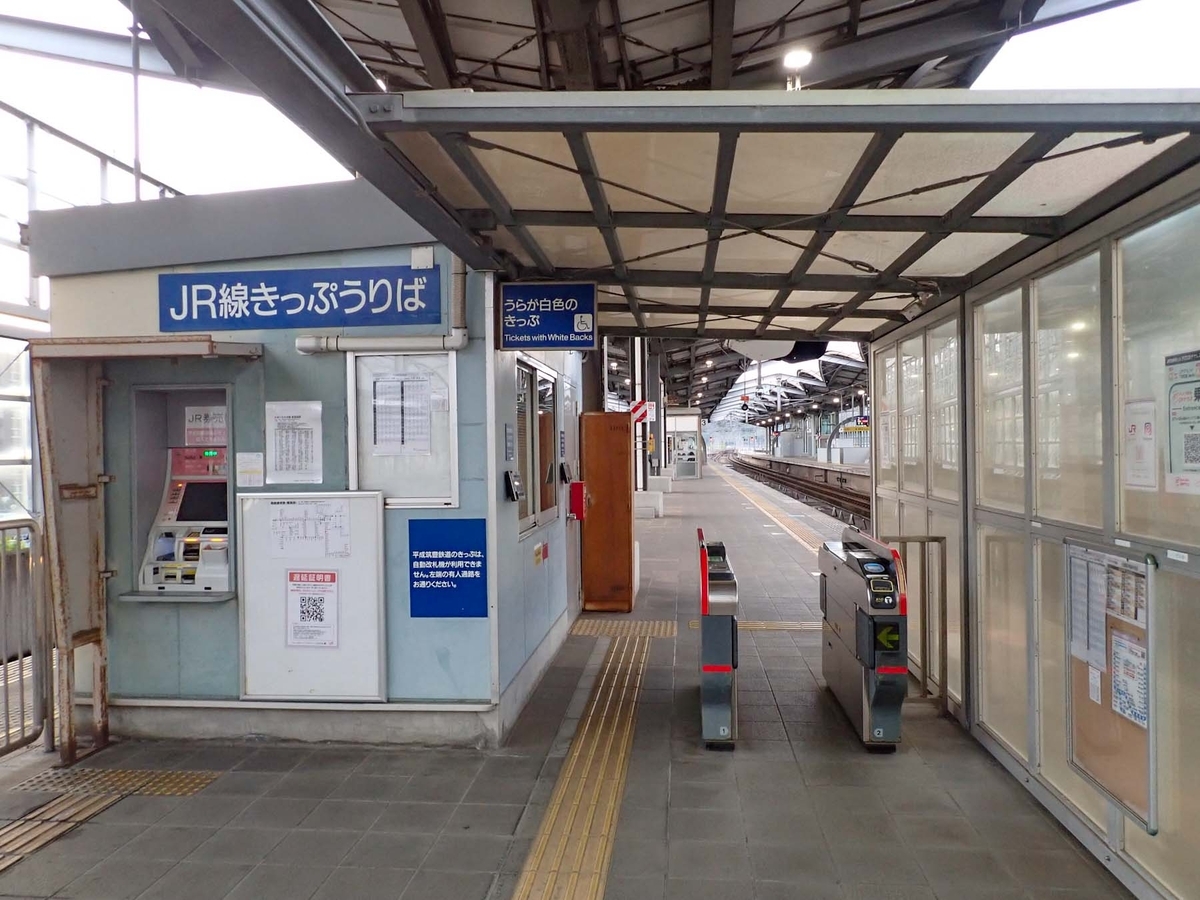 下の一連の写真は、3,4番のりばのホーム端に有る平成筑豊鉄道の5番のりば。JRホームから出るための自動改札機と、この向こう側にはJRの自動券売機が設置されています。平筑の切符で通る場合は有人改札を通るように案内がありますが、このときは無人でした。この改札の向こう側、待合所の後ろにはJR改札外に通じる階段があるので、JRの入場券で5番のりばに入るときは、本当は一度入場券を回収されないといけないのでしょうね。