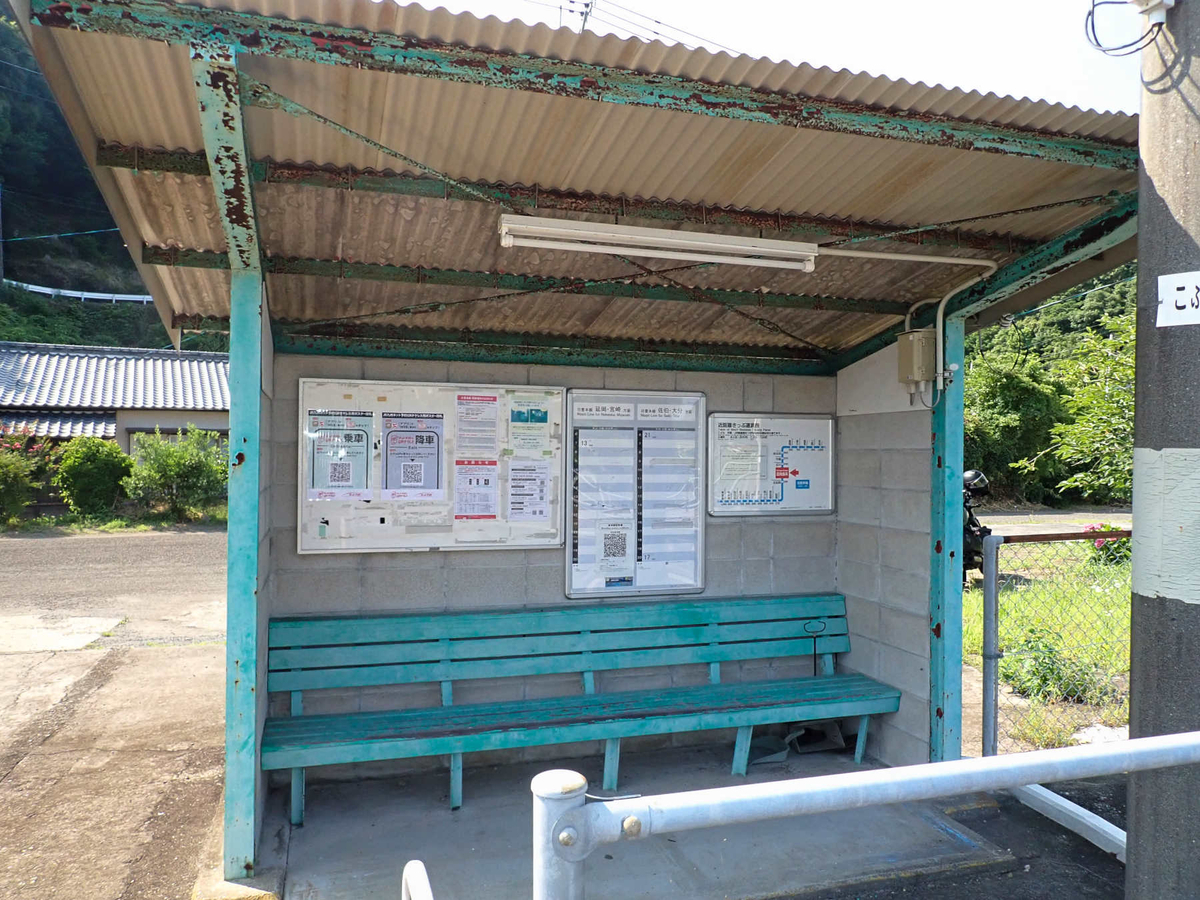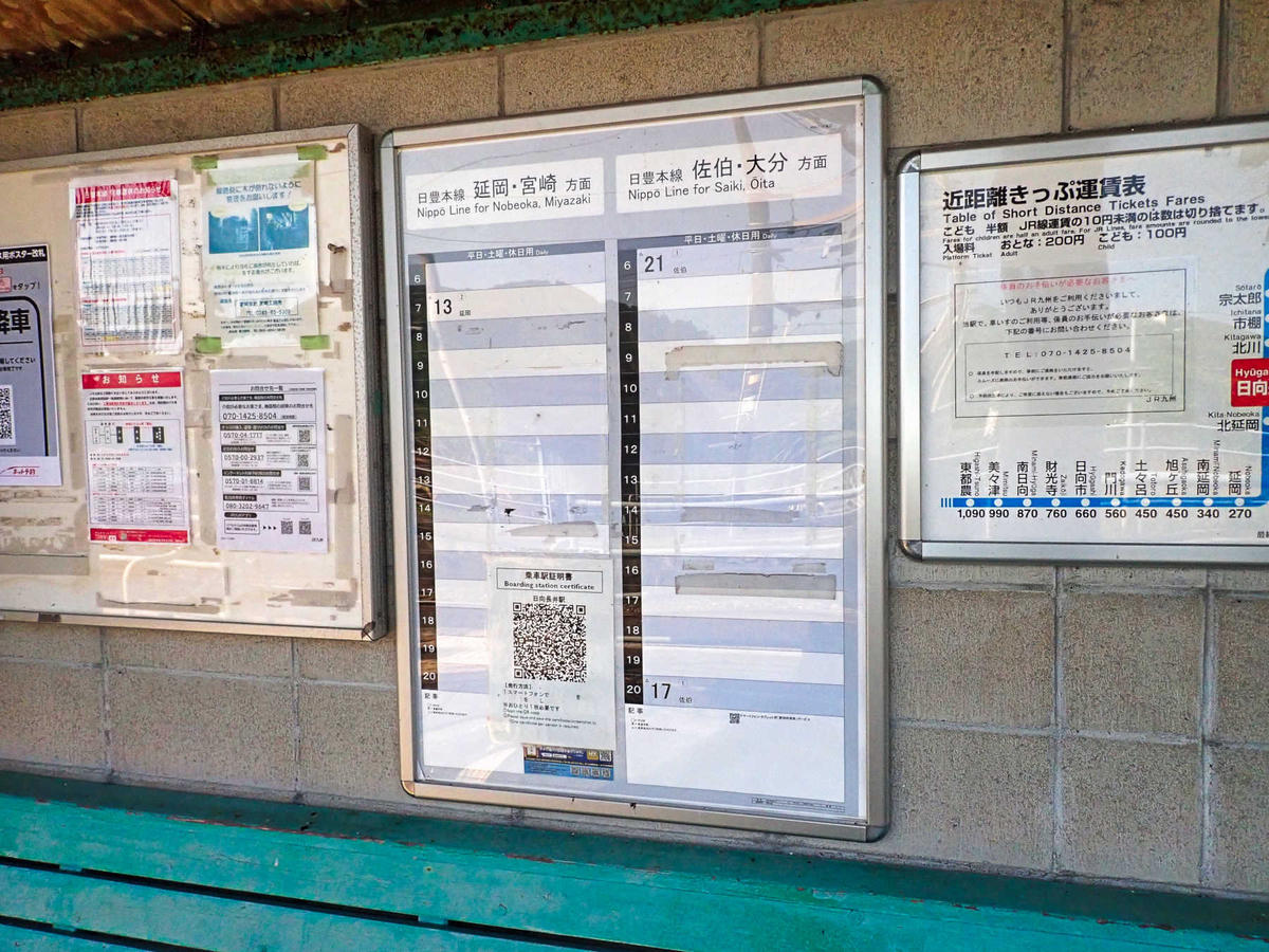 駅正面側(西側)の待合室に時刻表などがかけてありますが自動券売機、自動改札機の類は無し。トイレも見当たりません。そういえばネットでは、延岡-佐伯間の列車本数の少なさを揶揄する話を時々見ますが、確かに時刻表には上りが2本、下りは1本しか時刻が書いてない。しかも単に少ないだけでなく、早朝深夜にしか列車が来ないというのがえぐい、話題になるのもしようがないです。