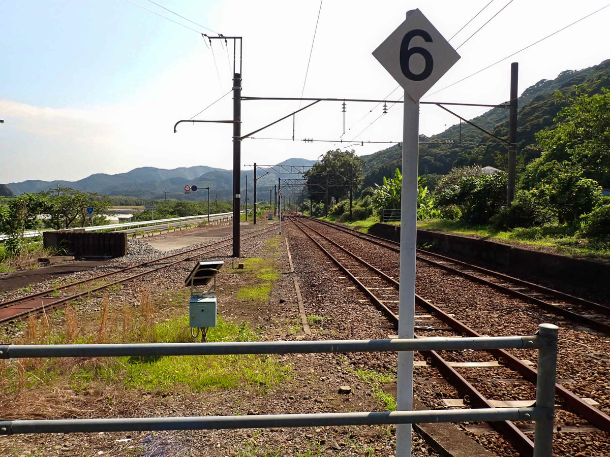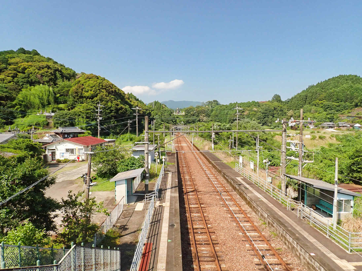 こちらは跨線橋から見た宮崎方面と大分方面の風景。東側のすぐそばに国道と北川が見えますし、大分方面はこれから山越えが控えているのが見て取れます。