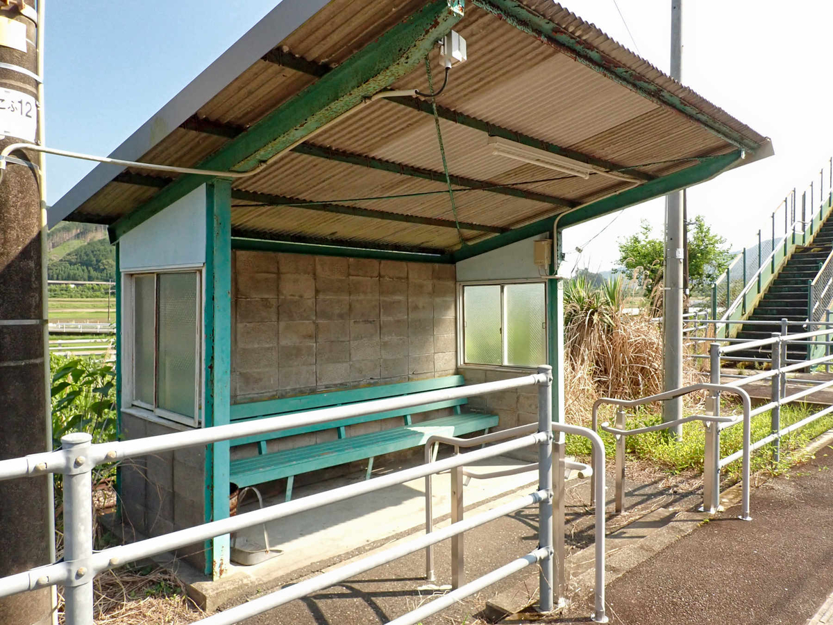 日向長井駅は駅舎はなくホーム上にコンクリートブロック造の待合所があるだけの無人駅。駅前広場は広く、かつては駅舎があったと思うのですが、待合所の建物財産票が昭和47年(1972年)なので、そのころから待合所に代わっていたのかもしれない。広場には駐車枠、駐輪場はないので、バイクを適当に停めて見て回ります。