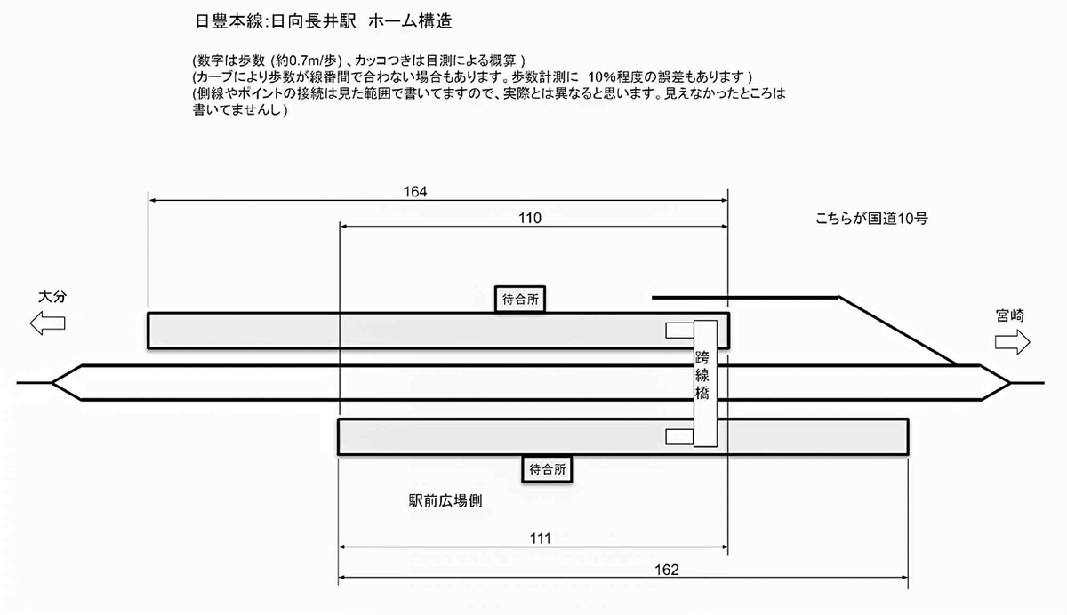 ホームは相対式2面2線で、宮崎側に側線がついています。ホームへは広場側の待合所横から入って跨線橋で連絡しています。ホーム長はどちらも約162歩。ここのホームにものりば番号は書いてなかったと思います。